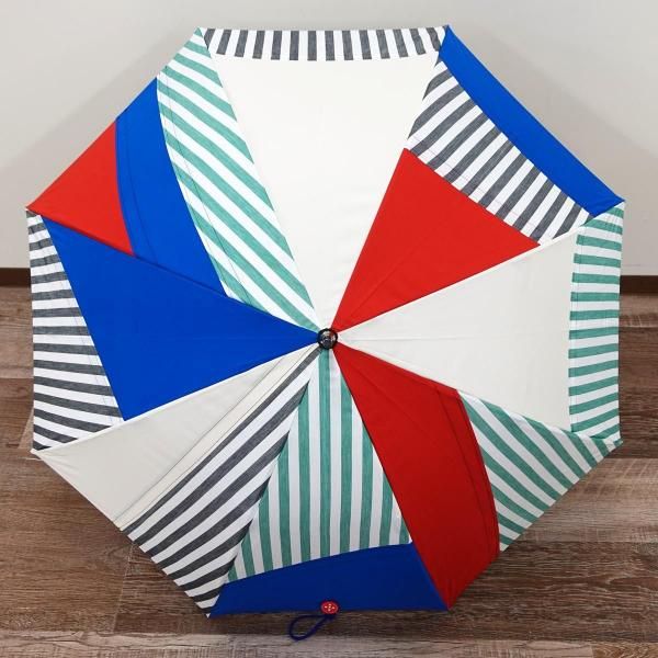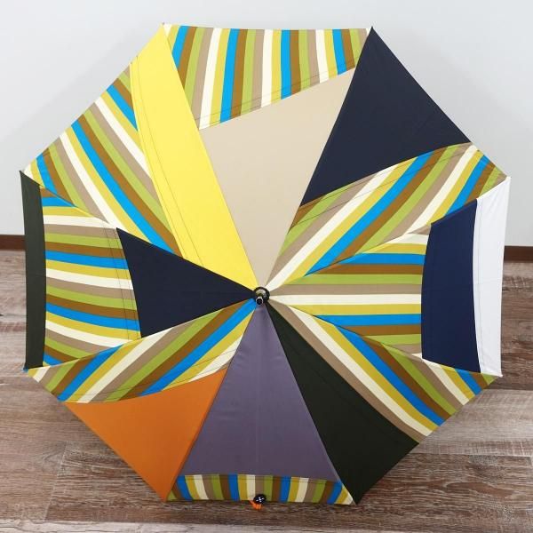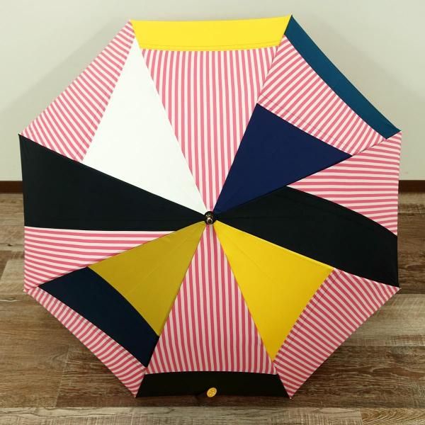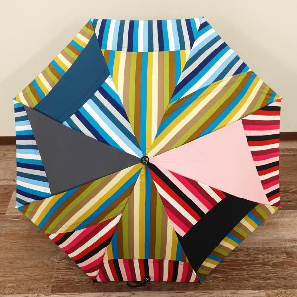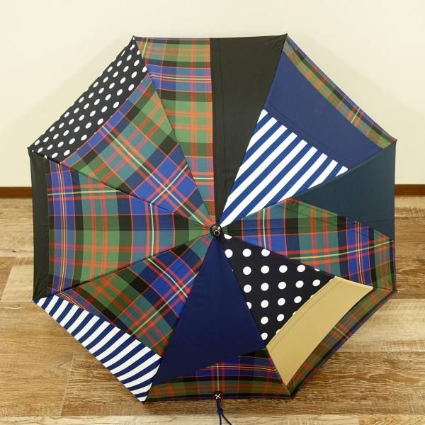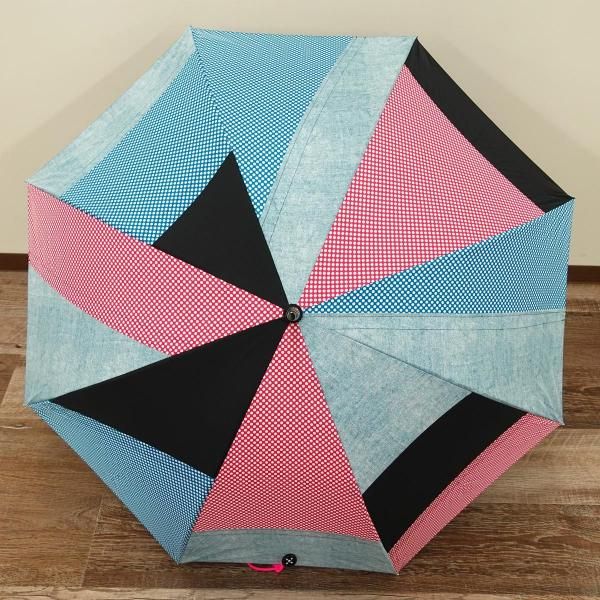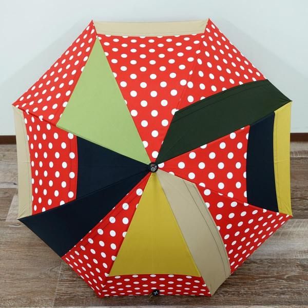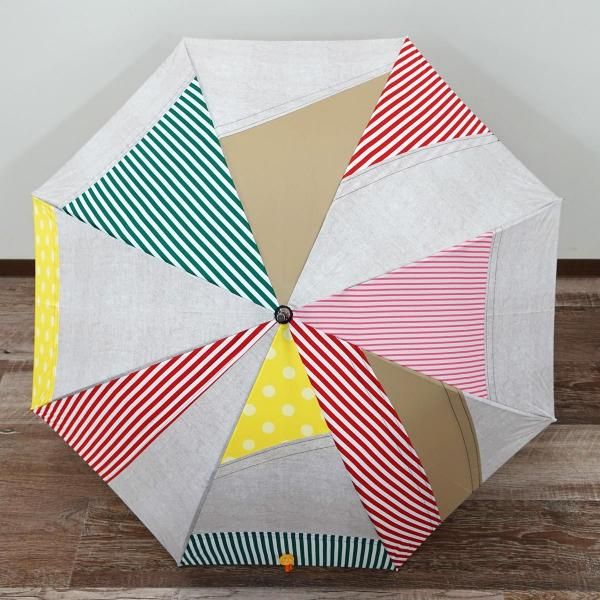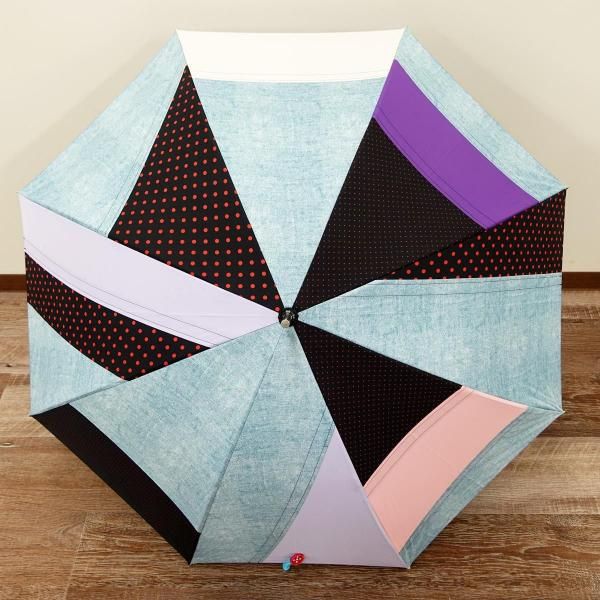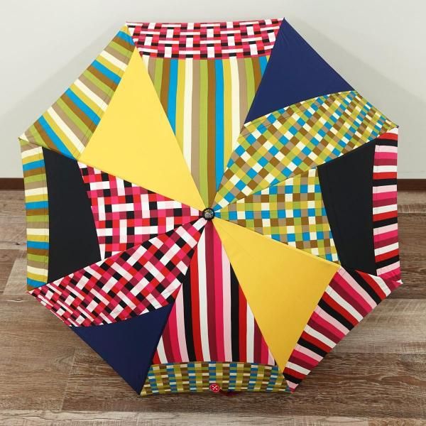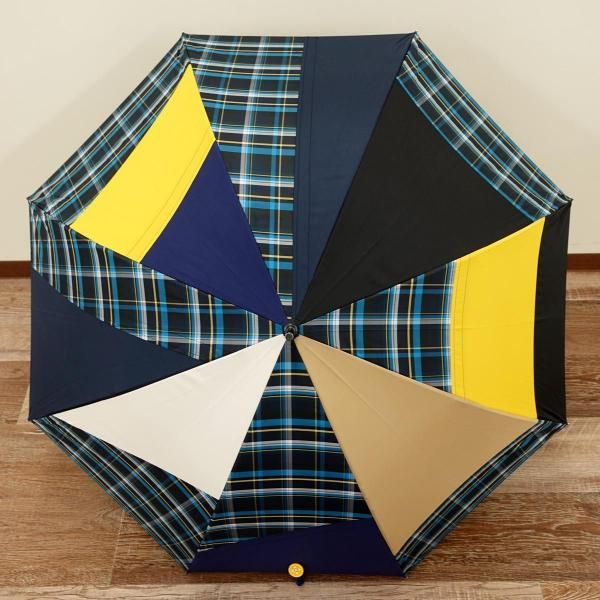 無地やチェックといった弊社定番生地を駒単位でランダムに組み合わせ張り分けパターンでデザイン製造した傘です。