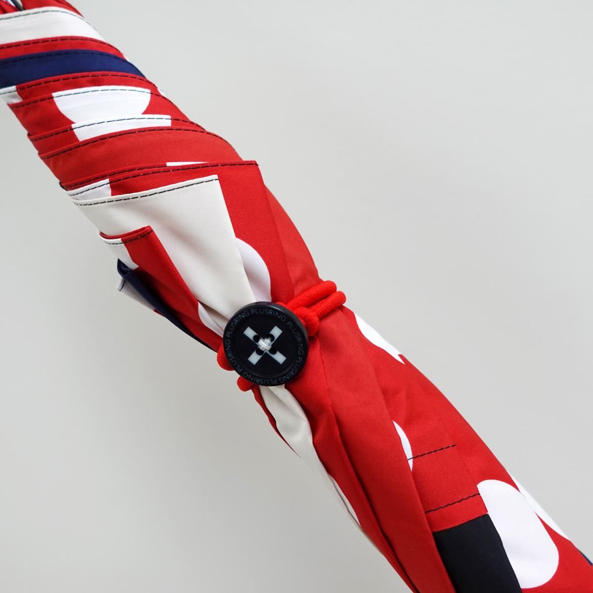 PLUSRINGと刻印されたボタンに、ゴムバンドのストラップを引っかける簡単仕様になっており、左右どちらから巻いても傘を束ねてしまうことができます(意匠登録申請中、特許取得済み)