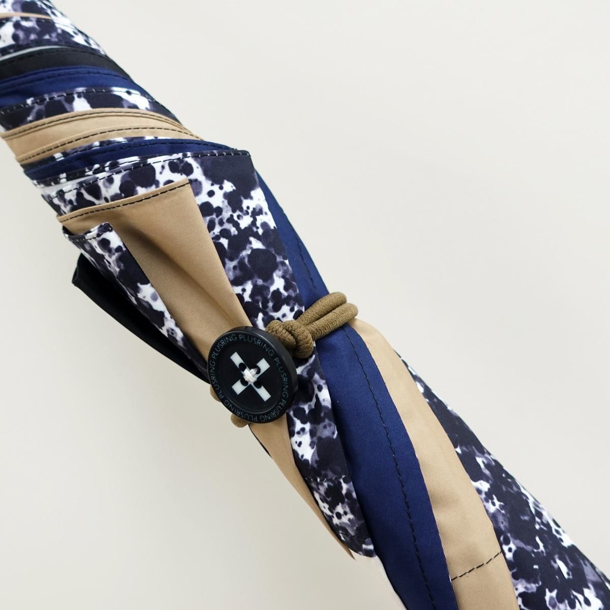 PLUSRINGと刻印されたボタンに、ゴムバンドのストラップを引っかける簡単仕様になっており、左右どちらから巻いても傘を束ねてしまうことができます(意匠登録申請中、特許取得済み)