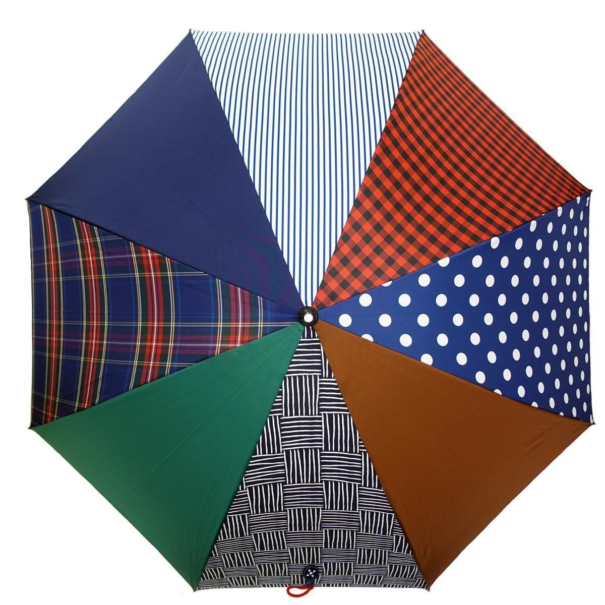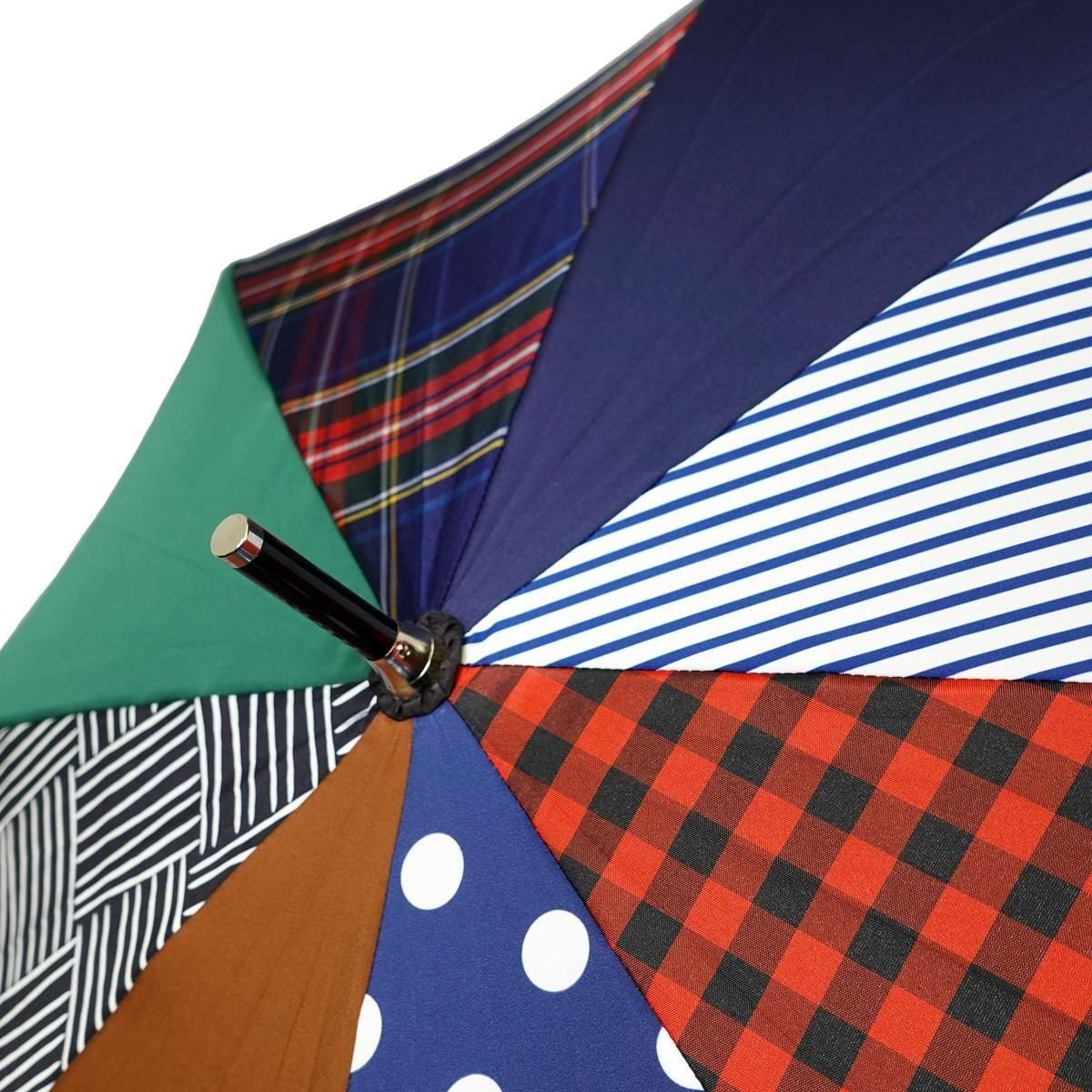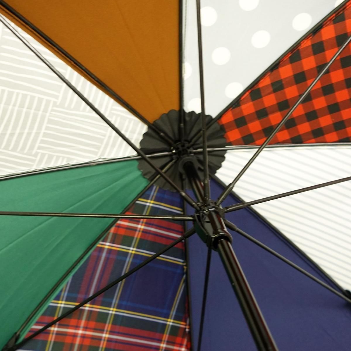 無地やチェックといった弊社定番生地を駒単位でランダムに組み合わせ張り分けパターンでデザイン製造した傘です。