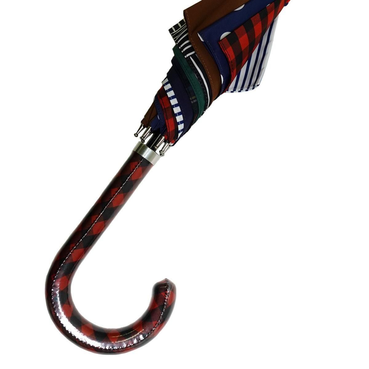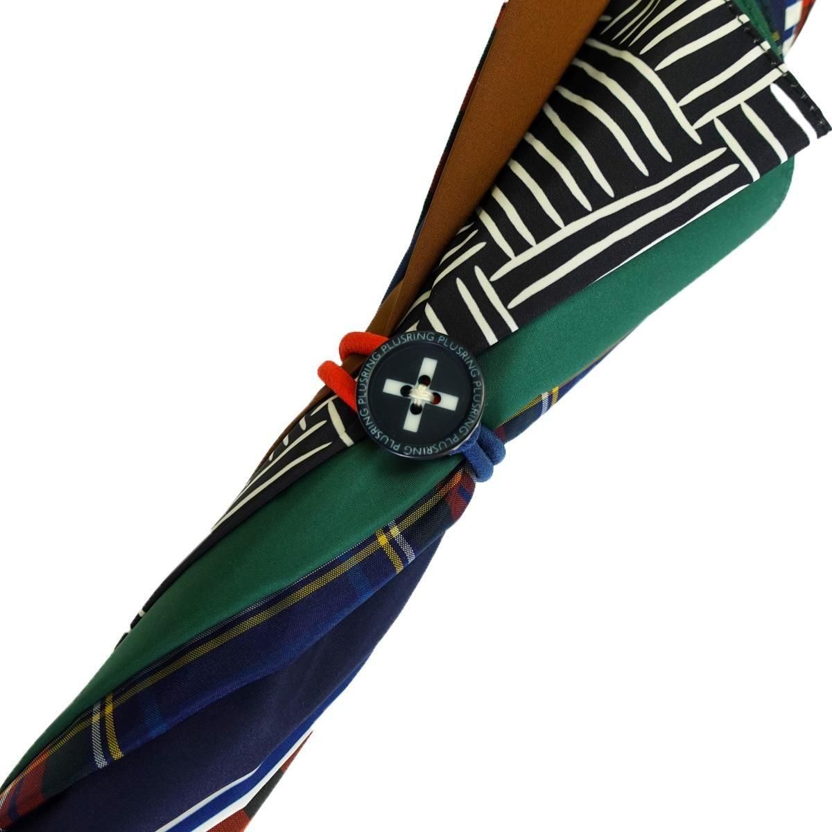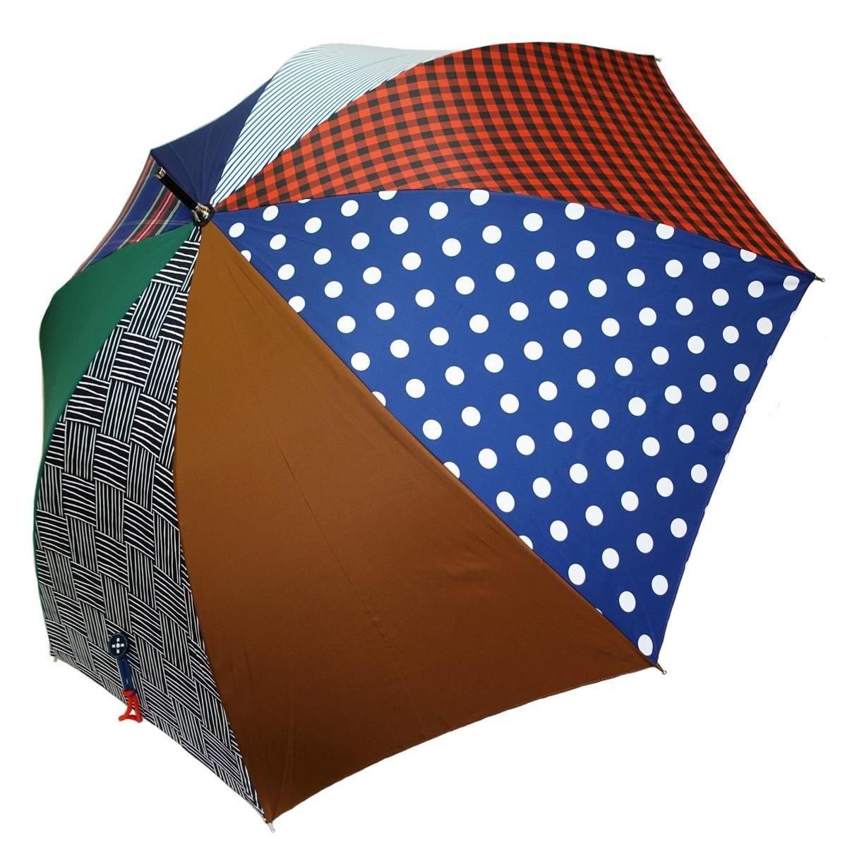 無地やチェックといった弊社定番生地を駒単位でランダムに組み合わせ張り分けパターンでデザイン製造した傘です。