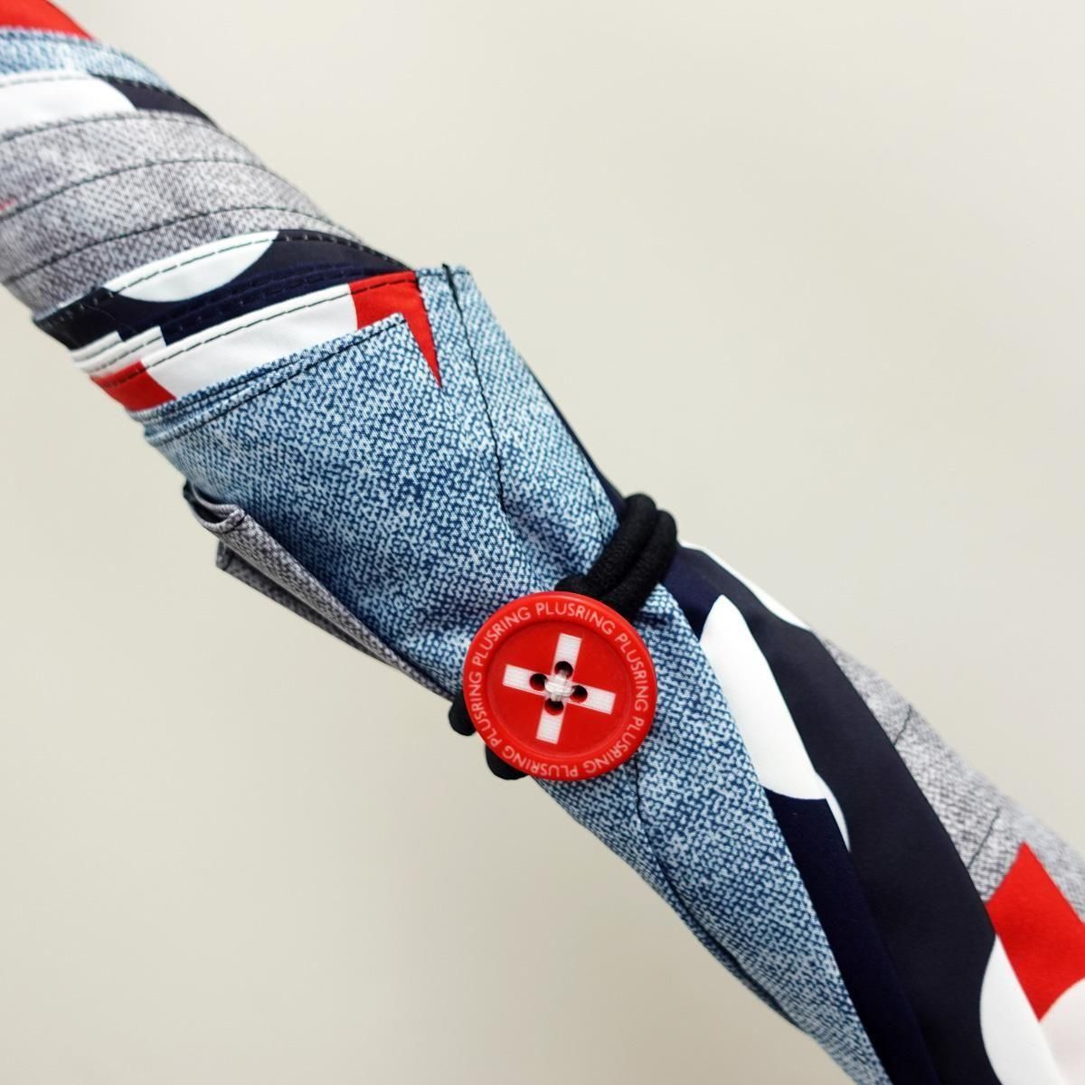 PLUSRINGと刻印されたボタンに、ゴムバンドのストラップを引っかける簡単仕様になっており、左右どちらから巻いても傘を束ねてしまうことができます(意匠登録申請中、特許取得済み)
