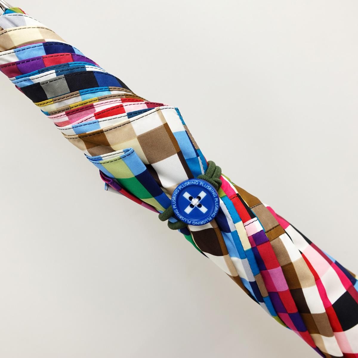傘の製造過程で発生する裁ち落としの生地やデッドストック生地、その他ハンドルなどの傘パーツをアップサイクルした+RINGのアイコンアイテムです。