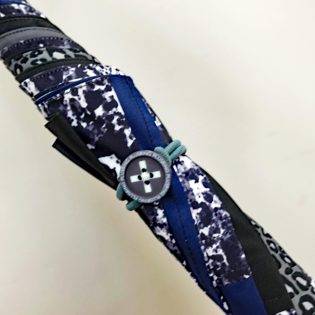 PLUSRINGと刻印されたボタンに、ゴムバンドのストラップを引っかける簡単仕様になっており、左右どちらから巻いても傘を束ねてしまうことができます(意匠登録申請中、特許取得済み)